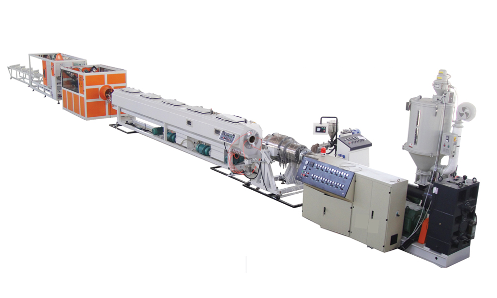 This production line is mainly composed of taper Single screw extruder or double-screw extruder, vacuum sizing tank, pray-cooling tank, tractor, cutter, stacker, After being equipped with different-sized dies, it can produce various-sized PE, PVC tubing for water supply, drainage, chemical anticorrosion, electrical wiring etc.